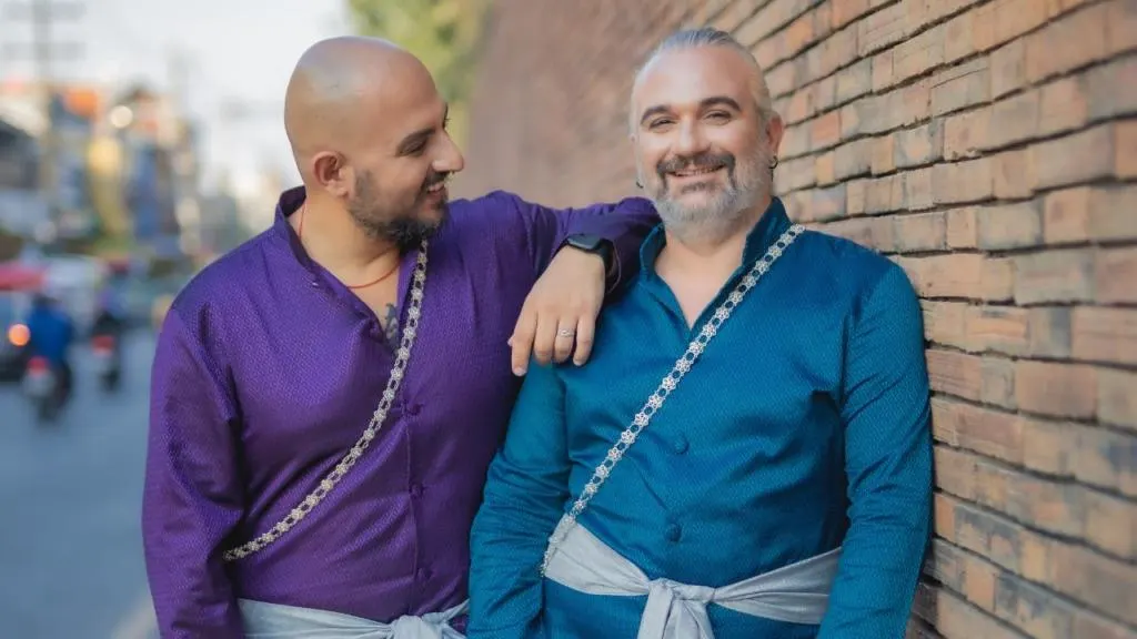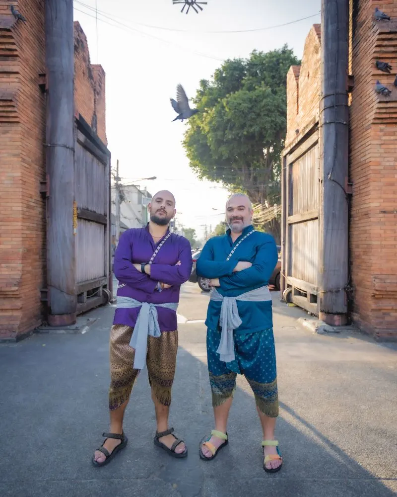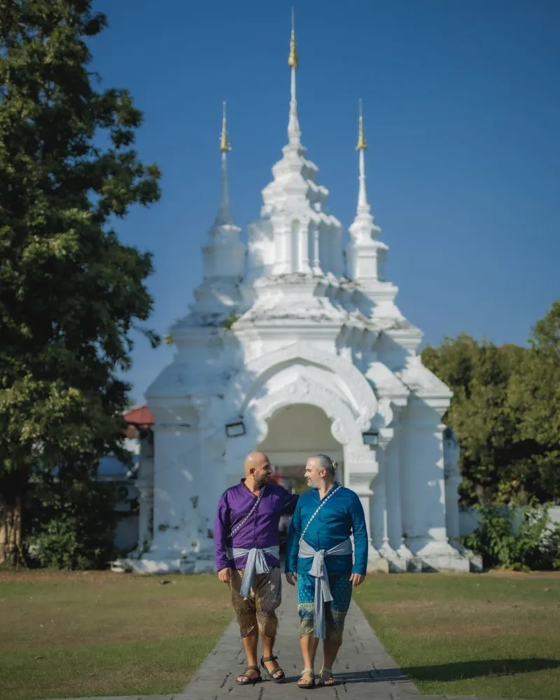 Una volta entrati nella boutique di Baan Or-Jao, che si trova nel centro storico di Chiang Mai, abbiamo scelto – con l’aiuto di una stylist – gli abiti che ci piacevano di più. Giacca viola e pantaloni dorati per Daniele e completo blu petrolio per me! Insieme eravamo bellissimi e gli abiti, che vestivano perfettamente, ci hanno permesso di sentirci sempre a nostro agio.